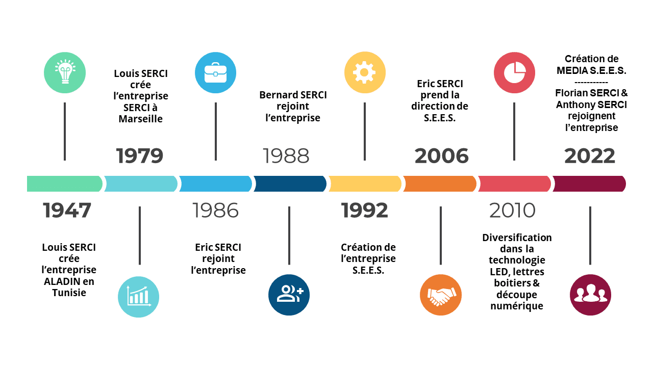 Ce dynamisme collectif conduit à la création de l'entreprise S.E.E.S. en 1992. Jusqu'en 2010, l'activité principale de l'entreprise était axée sur le néon et les solutions adhésives, dans la continuité de l'héritage lumineux de Louis Serci.